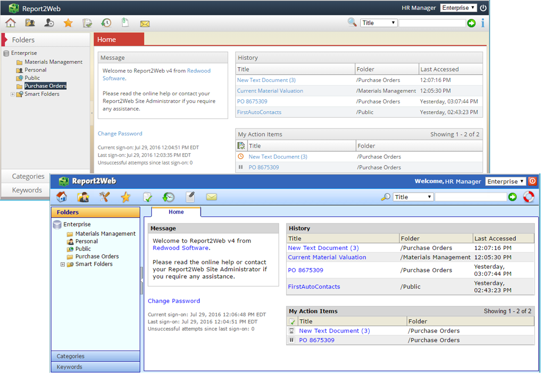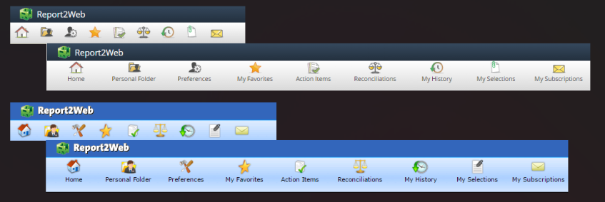 Unless changed by your administrator, by default, the Report2Web application will display with the grey, red and blue based “Novum” theme when you first sign in to the application. If desired, within your User Preferences, you can switch between the “Novum” theme and the more blue-based “Classic” theme.  In both cases, the layout of the application will be the same, but colors and icons will be different. Examples of Novum and Classic themes are shown below.  For Online Help purposes, all content is referencing the look and feel of the Novum theme.