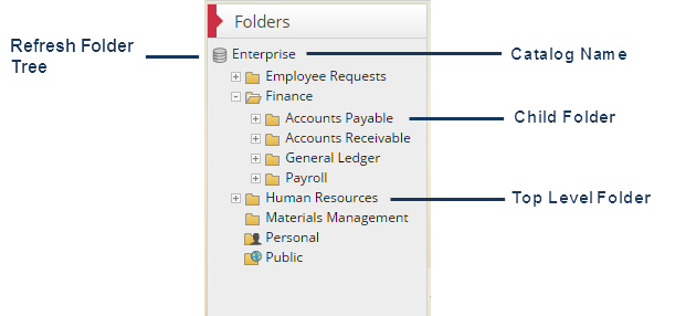 Folders are typically organized in a hierarchy structure with root and subfolders. Top Level folders that have additional subfolders beneath them will have a plus icon displayed next to the folder name. Click on the plus icon to expand or collapse a folder.