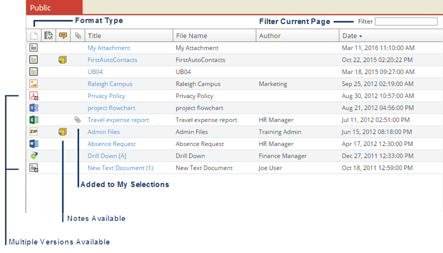 Depending on Global List View Settings Global List View Settings and individual List View Settings established by your administrator, the default naming conventions, display columns, column order and sort order implemented in your environment may be different than those shown. For example, the administrator may have opted to rename the “Description” label to “Report ID” or perhaps opted to remove the "File Name" column when viewing documents within a folder.