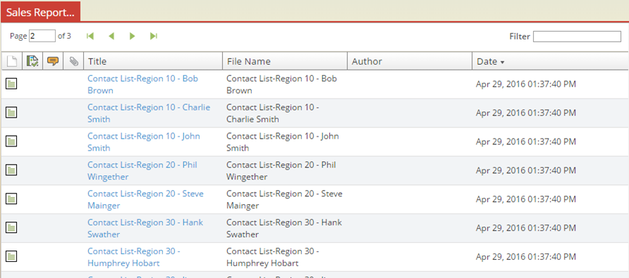 As any number of documents can be housed within a given folder, administrators establish defaults to control how many items per “page” will be displayed when you view the list of content within a given folder.  If the total number of items contained within a given folder exceeds the defined limit, you can directly jump to a specific “page” of the list by entering the page number in the supplied text box or you can navigate through pages using the first, previous, next and last page buttons.