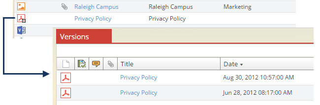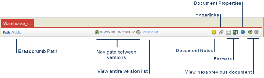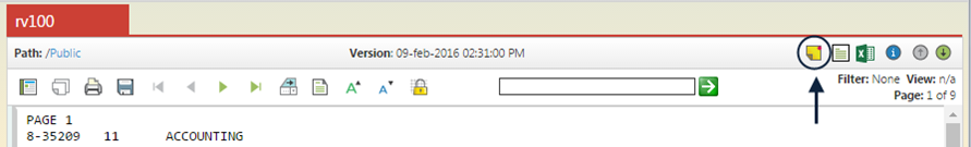 If multiple versions of a given report are available, from any list view, tap once on the Format icon and select the Versions option.  The Version list will open in a new tab within the browser. Tap the Close button or click the X on the Versions tab to close the dialog.