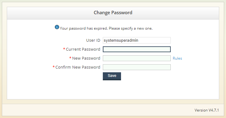 If your password has expired, before successfully signing in again, you will be prompted to provide your Current Password along with a New Password that adheres to the policies established. To view the password rules currently enforced, click on the Rules label. Depending on the rules enforced, you may be prohibited from reusing a previous password.  Click the Save button to finalize your new password.  If your new password does not conform to all the password rules, an error message will be displayed, prompting you to reenter a new password. If there are no errors with the creation of your password, a message will be displayed indicating the successful change. Follow the link included in the message to return to the sign in page and then enter your user id and newly created password.
