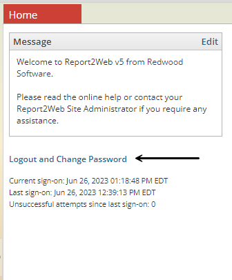 Similarly, if your administrator has enabled the option to let you change your password at any time, a Change Password link will be displayed on the Home page. When clicked, it will prompt you to provide both current and new password information.