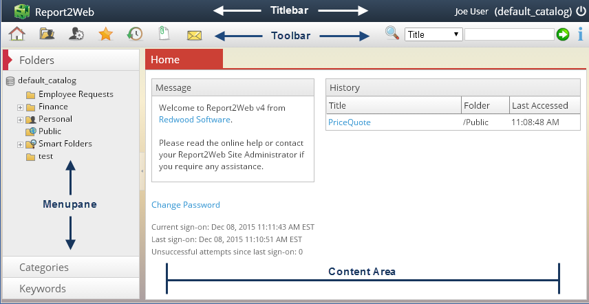 Before you can begin viewing and working with reports, you will need to become familiar with the main areas of the application and how they are used. There are four distinct areas that you will be interacting with: The Title bar, the Toolbar, the Menu pane and the Content Area.