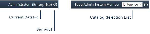 At the top of the application window, the Title bar displays your name and the current Catalog name. To the right of the Catalog name, you can log out of your session by clicking the Sign out button. If you have access to more than one Catalog, a list enumerating all available Catalogs will be displayed (in alphabetical order) rather than a static Catalog name. The list of Catalogs available for selection is based on your individual security settings and as such, may not be a complete Catalog listing. To switch to a different Catalog, select the Catalog name from the list.