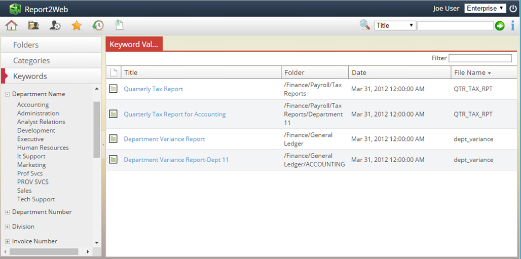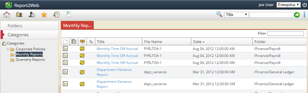 One of the most frequently used methods of finding a report is to simply navigate through the folder tree to locate a desired report. The folders that you can see within the tree are determined by security settings (known as Content Access) as established by an administrator.