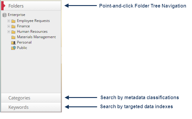 Located on the left side of the window, the Menu pane provides access to folder navigation, Category and Keyword searching and a variety of administrative functions. Many of the functions within each tab of the Menu pane are controlled by authorizations setup by your administrator. To switch between areas of the Menu pane, click on the title of the desired tab. The typical tabs that end users will have access to have been highlighted below.