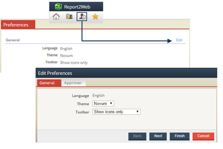 In the screen shot below for example, alternate languages have not been enabled on the Report2Web server so the edit option is disabled, while the ability to modify how toolbar icons will be displayed (with or without a text label below them) is accessible along with the Theme. After making any necessary changes, click Finish and refresh the screen or log out/in to see your changes.