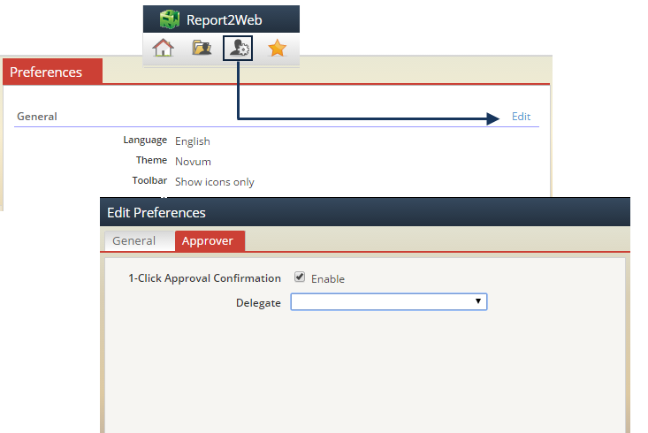 Allows you to specify your personal preferences for configurable items such as toolbar display, application theme and approval delegates.